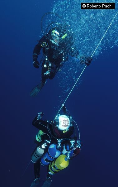 Per raggiungere i -202 metri in configurazione autocontenuta è stato osservato il seguente profilo d'immersione: dai 0 ai 40 metri fabio pajoncini Ottaviani e Guido oggioni Tiepolo sono scesi con una miscela iperossigenata ean 32; a 40 metri è stato compiuto un cambio di gas con una miscela trimix 10/50 (10% di ossigeno, 50% di elio, 40% di azoto) per evitare gli effetti narcotici dell'azoto e l'intossicazione di ossigeno in profondità. Il trimix 10/50 è stato utilizzato fino a 110 metri di profondità, dove Guido si è fermato ad aspettare e Fabio, prima di proseguire verso il fondo, ha fatto un altro cambio con la miscela ottimale, un trimix 5/76, con il 5% di ossigeno, il 76% di elio e il 19% di azoto. Alla profondità di 202 metri, il 5% di ossigeno ha raggiunto una PpO2 di 1,06 ata, mentre il 19% di azoto ha dato una narcosi equivalente a una immersione con aria a 40 metri; l'elio in sostanza ha poteri narcotici nulli a quelle profondità. La stessa miscela è stata usata per la prima parte della decompressione, durata undici minuti, fino al ricongiungimento con Guido a 110 metri. Qui giunto, Fabio ha nuovamente cambiato miscela e ha ripreso a respirare il trimix 10/50 fino a 39 metri., dove ha dovuto fare soltanto due minuti di deco con la miscela ean 32. L'ean 32 gli ha consentito un più veloce rilascio di gas inerte grazie al maggior gradiente di ossigeno, respirato per ben trentuno minuti fino alla profondità di 21 metri. Da questa quota è stata usata una miscela ancora più ricca di ossigeno, l'ean 50% (50% di ossigeno, 50% di azoto), respirato per quarantanove minuti, fino all'ultima tappa dei 6 metri, dove per quaranta minuti è stato respirato ossigeno puro. terminata la sosta, Fabio è risalito in superficie, sempre respirando ossigeno puro, ad una velocità di un metro al minuto.